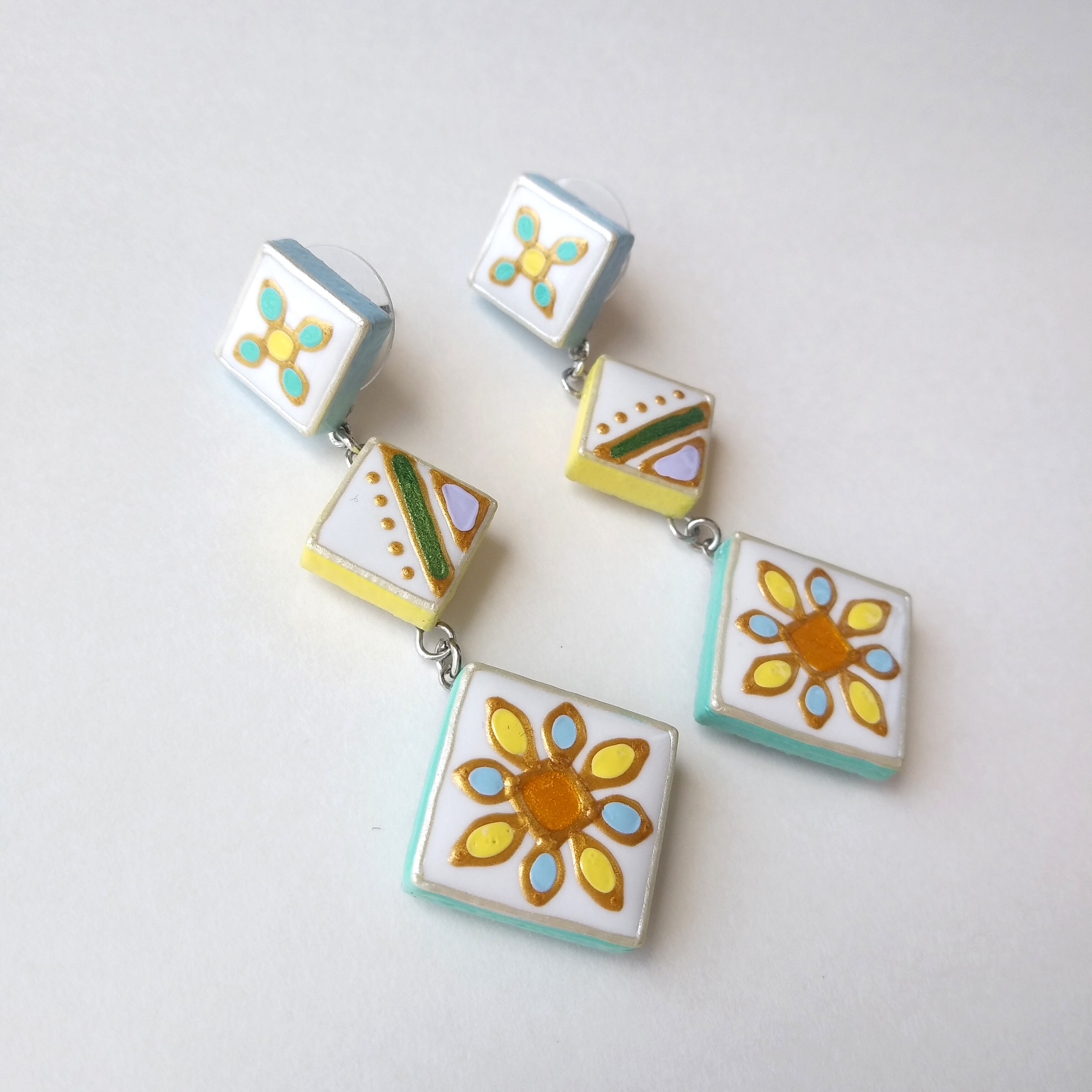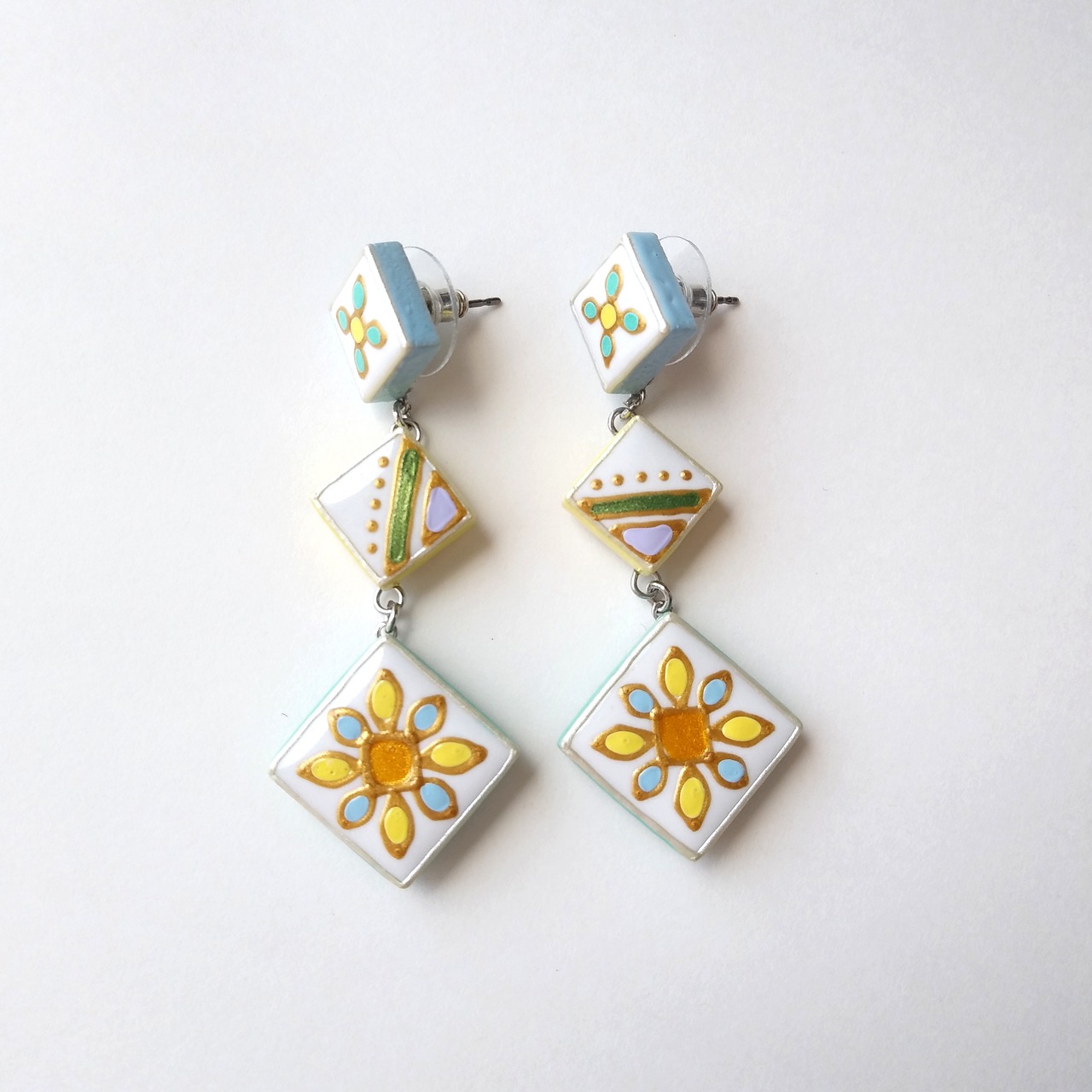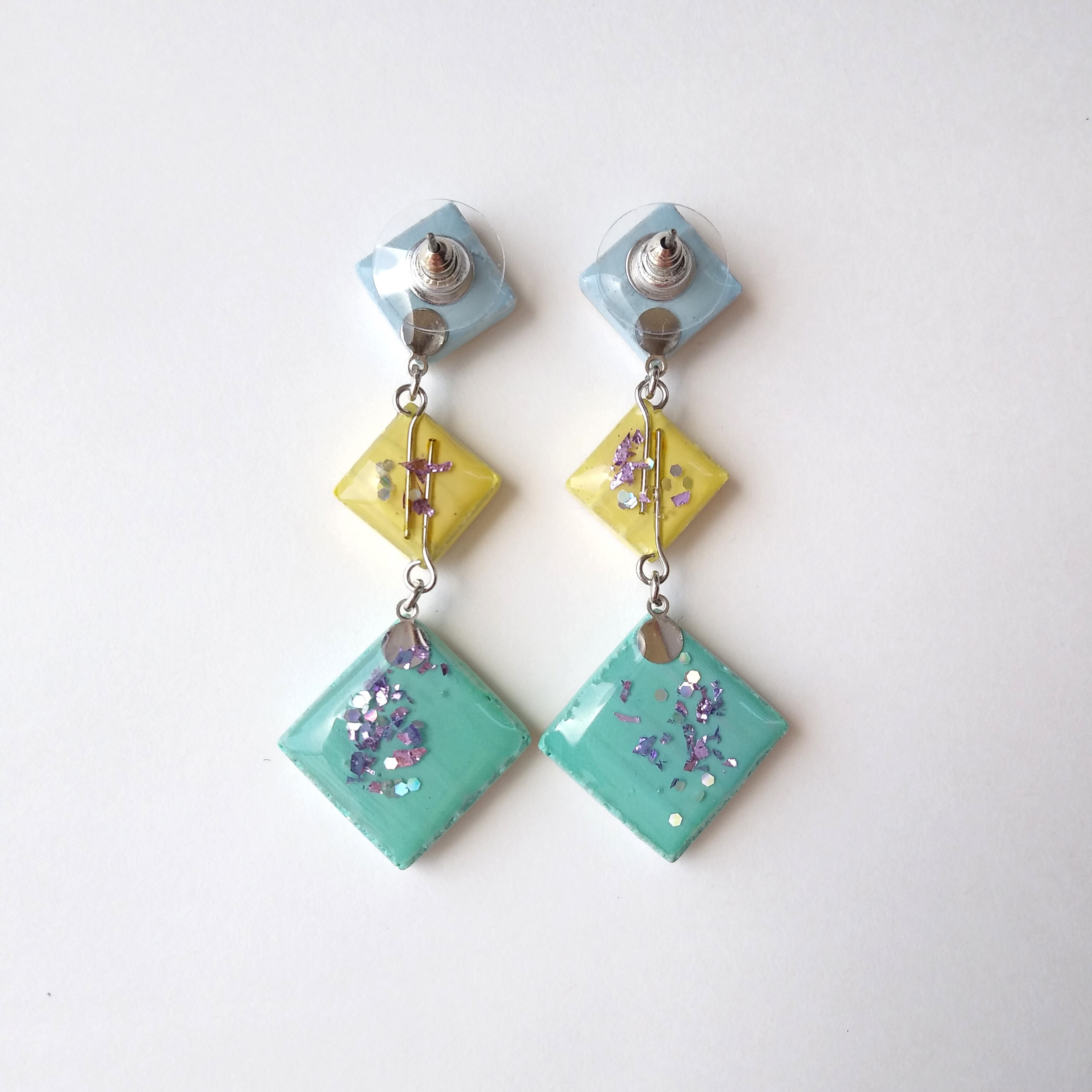 存在感のあるカラフルな3連タイプのイヤリングになります。
